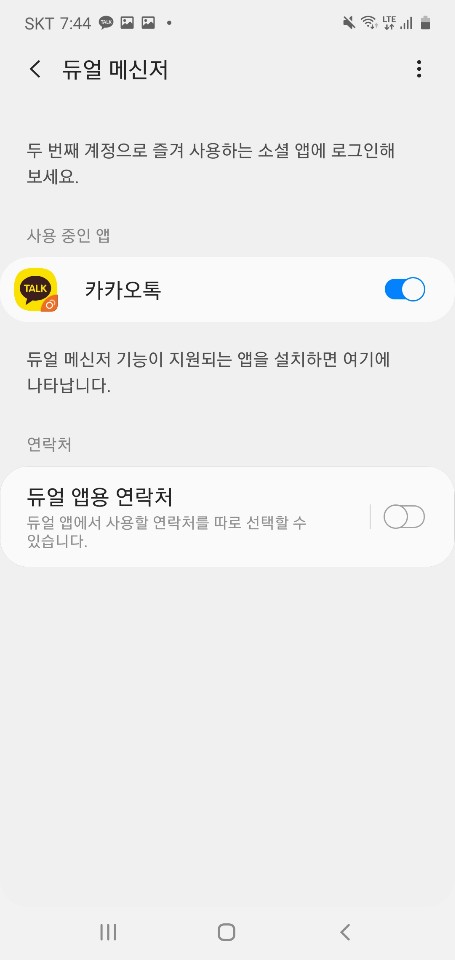 설정에 들어가서 유용한 기능>듀얼 메신저 로 들어가 줍니다.